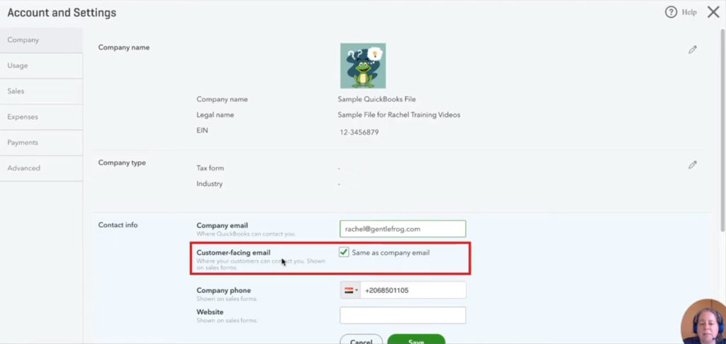 Below this field is a “Customer-facing email” check box. Check this box if you’d like the Company email you just entered to be the same one customer’s will see on sales forms.