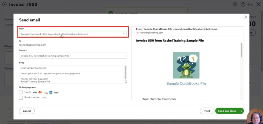 You’ll see a preview of the email that you can edit. You may notice the From field will have a quickbooks email address. Don’t worry, everything’s correct. I’ll show you where your email address appears in the email when your receive it.