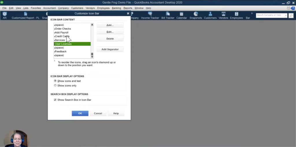 Adding icons to the icon bar in QuickBooks Desktop Premier 2020