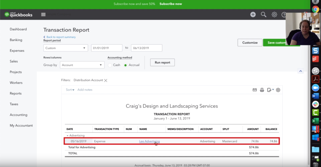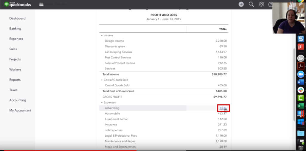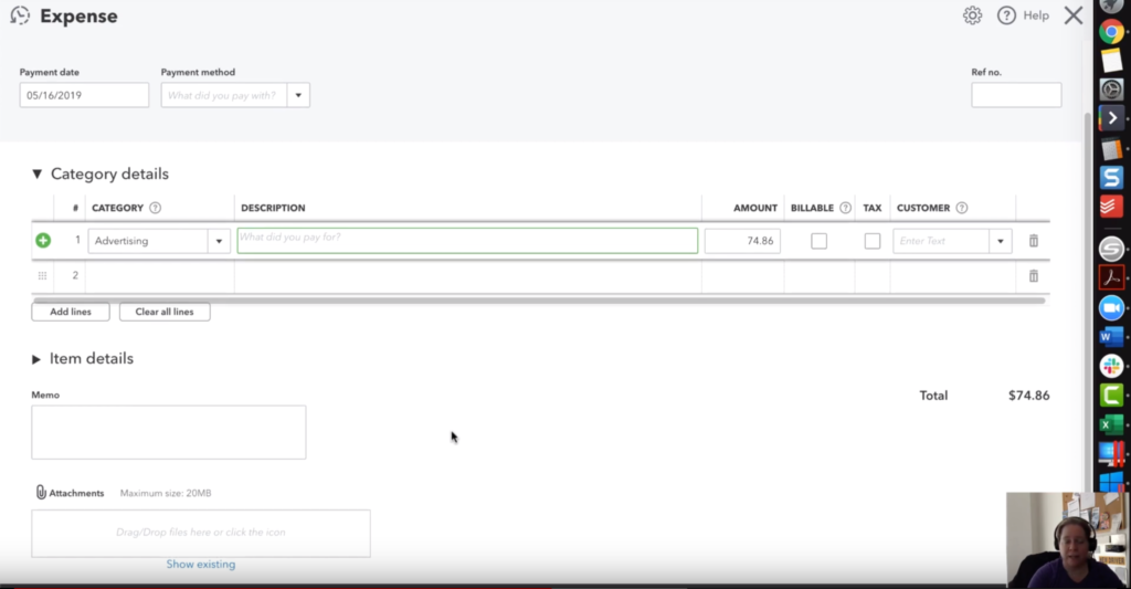 Now it is important to note that any book keeping system is only as good as the data you put into it. If you click again on the dollar amount quickbooks will show you some finer detail. You will thank yourself in the future if you include a relevant description and any supporting documents like invoices or receipts.
