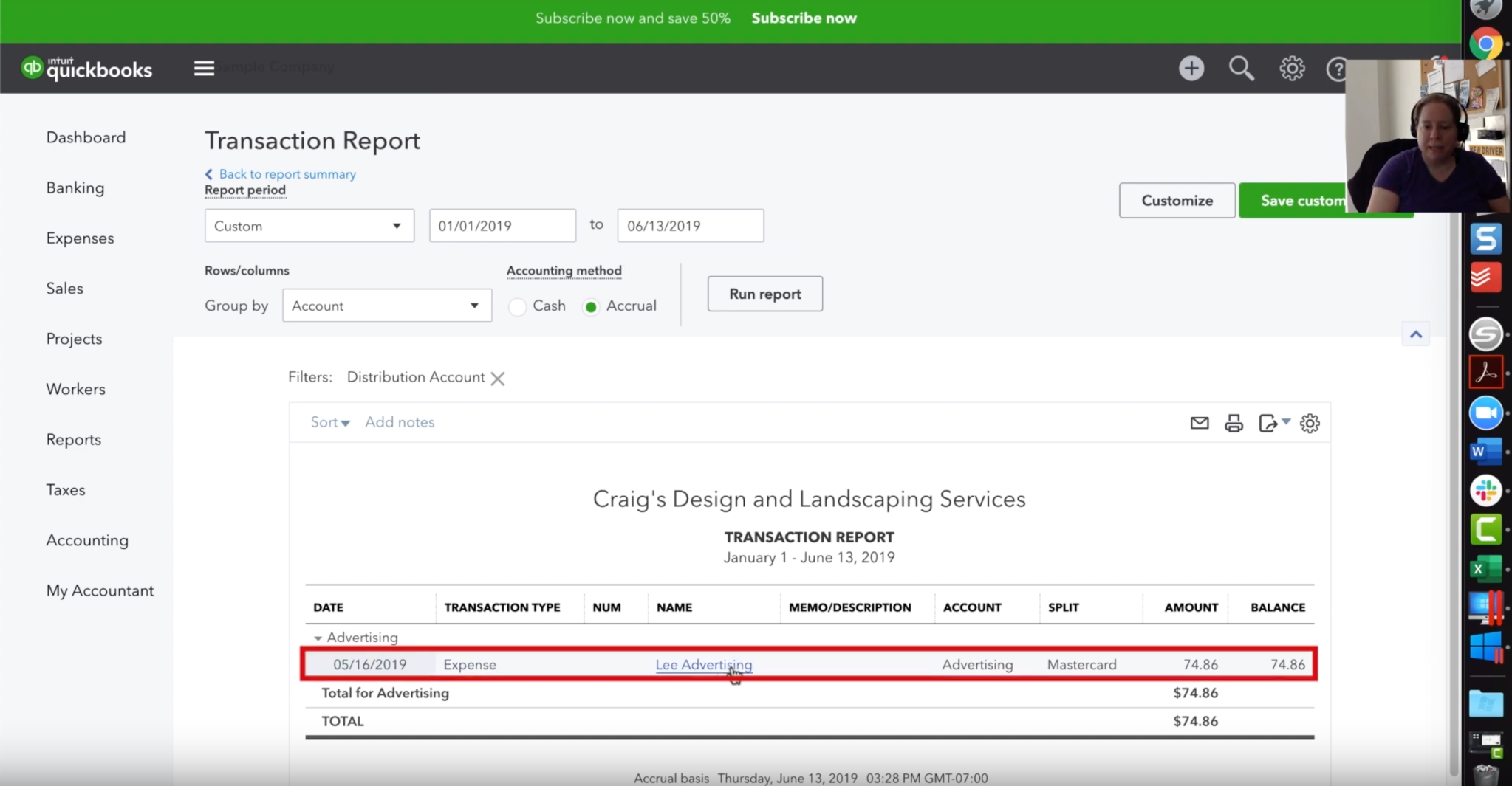 If you look closely at each line item, you’ll notice that they’re clickable. So if you click on the dollar figure associated with the item that says “Services,” you’ll be brought to a transaction report. It’s important not to confuse these transactions with invoices. What you’ll find on this page is the portion of potentially many different invoices that have been associated with “services” account.
