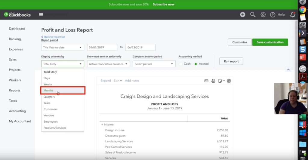 Now that we know the basics of how to read, update, or modify these items in your profit and loss report, let’s see how we can use this information to look at how our business is behaving over time. Have a look at your profit and loss report, click the dropdown “display columns by” and select months. What this will let you do is better detect for anomalies. You will know your business best so you may know that you pay monthly insurance premium of $85.35 and you will see that expense in every column (month). Well what if one month you see it’s double that? Or it’s zero? You’ll be able to click into that expense and see what created that additional cost or you can look deeper into why the cost didn’t hit your account system. Maybe you accidentally paid on your personal credit card.