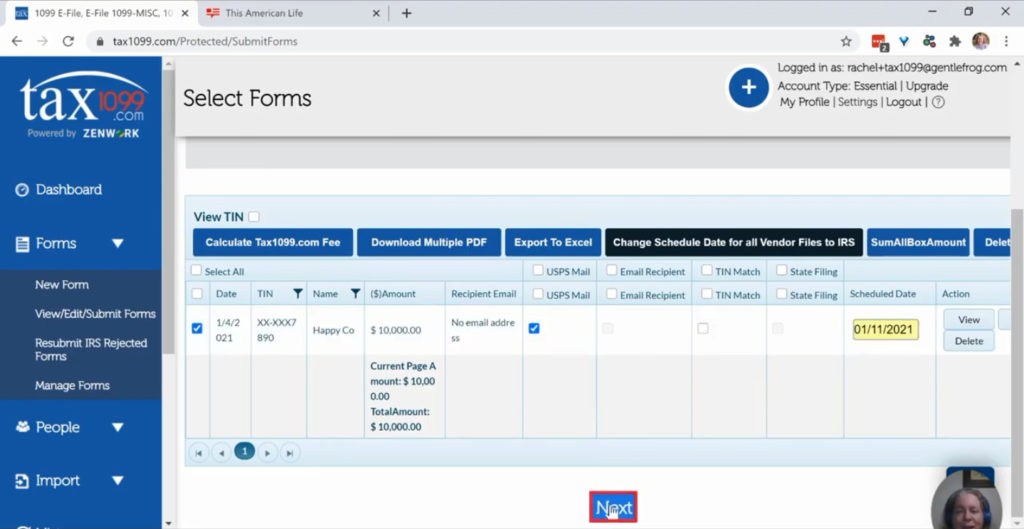 You’ll need to select the Payer and then you’ll see the 1099-NEC form you created.  Check the box to the left of the form, select USPS Mail and click the Next button.