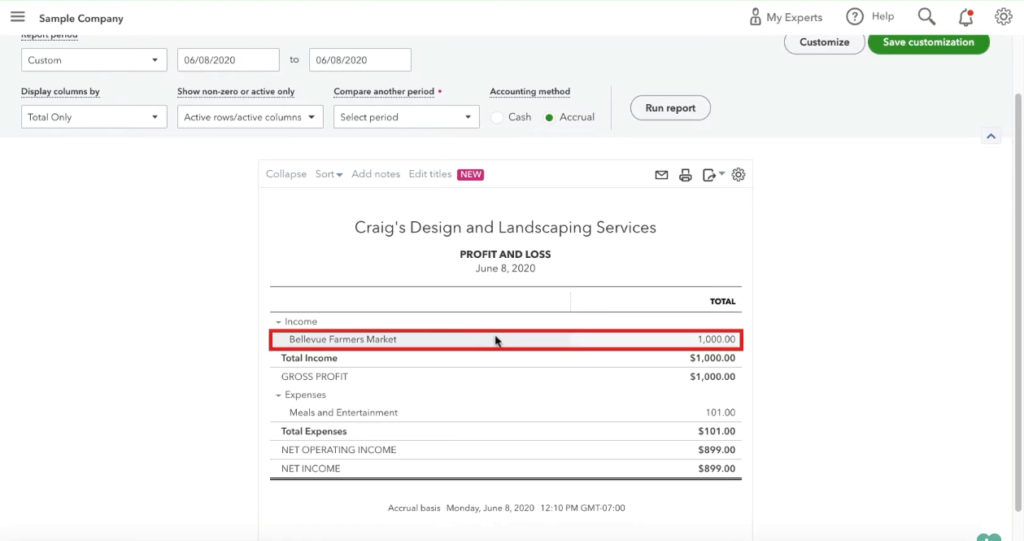 You can see the deposit from the Bellevue Farmer’s Market appears under Income.