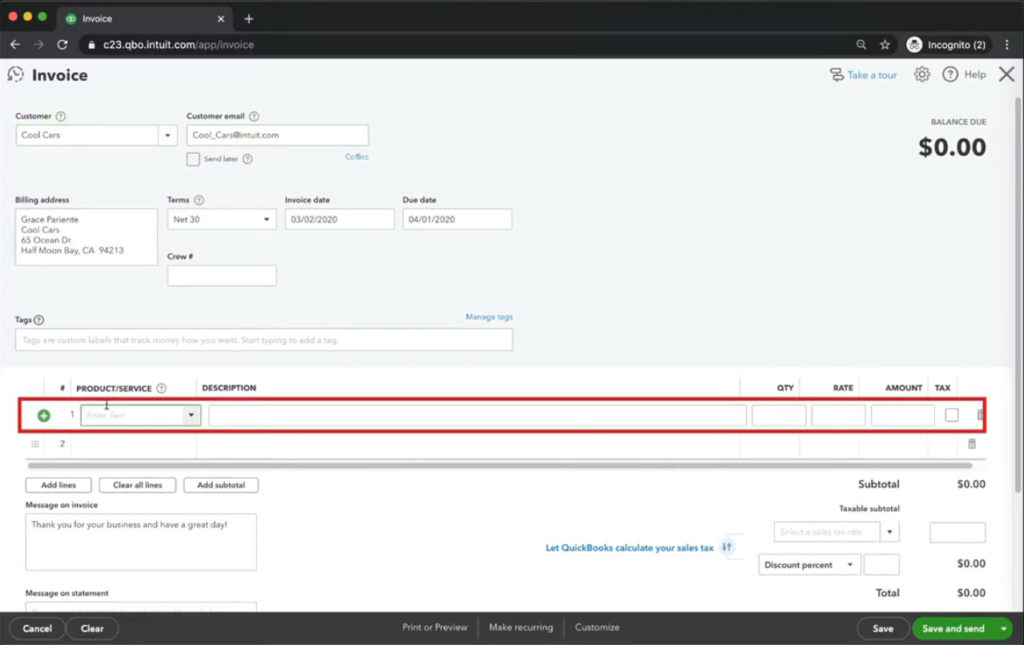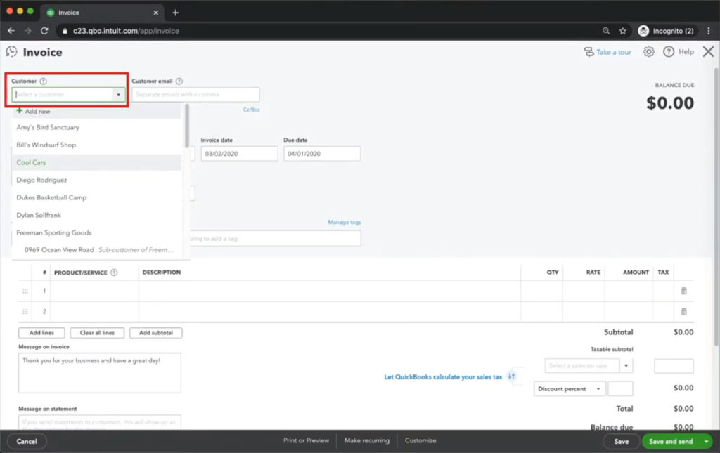 To find the customer for whom you want to create an invoice type their name in the Customer field.