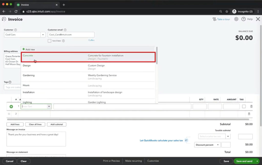 Clicking on the drop down will show you a list of the things you might sell to a customer. In this example I’ll choose concrete.