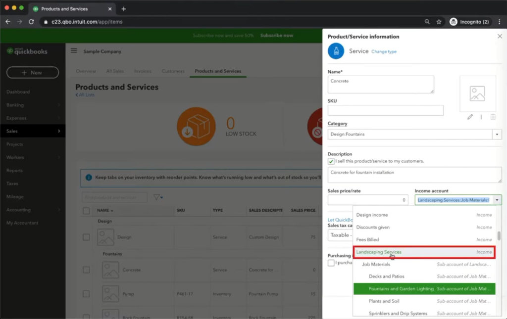 My concrete example is in a sub-account Landscaping Services -> Job Materials -> Fountains and Garden Lighting.