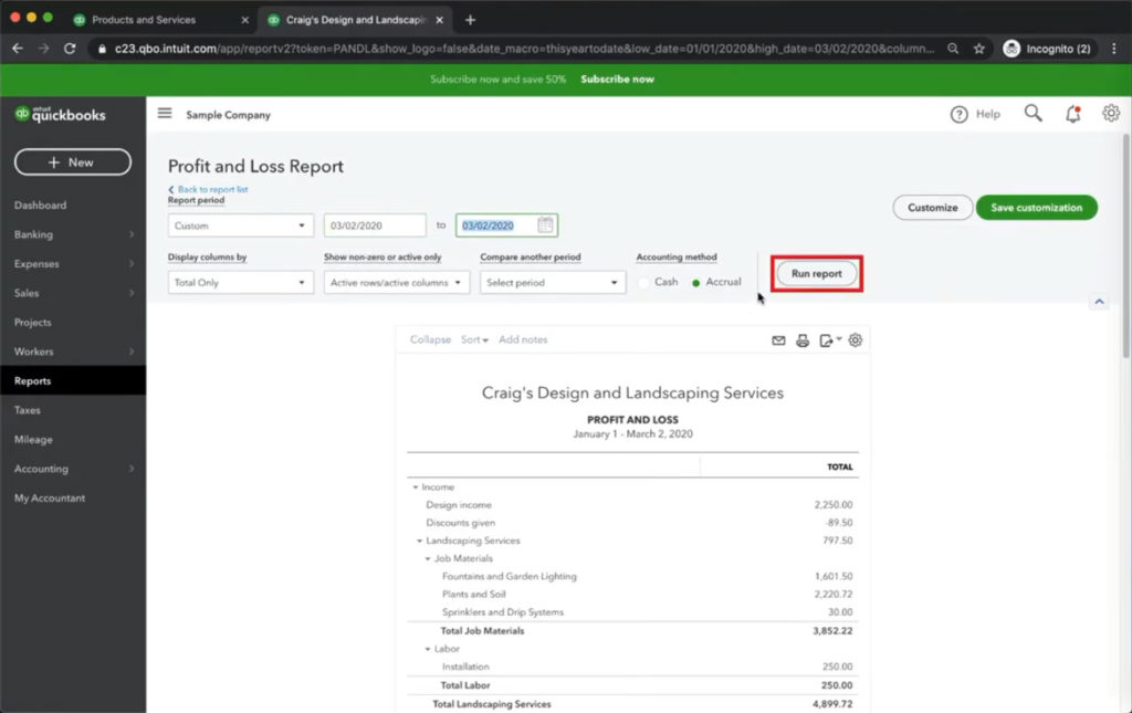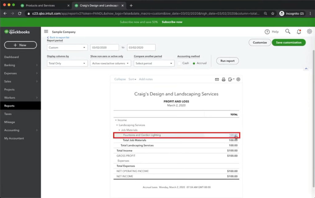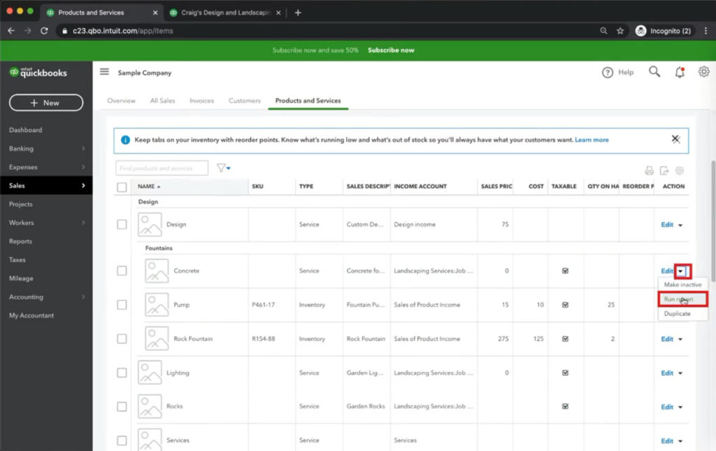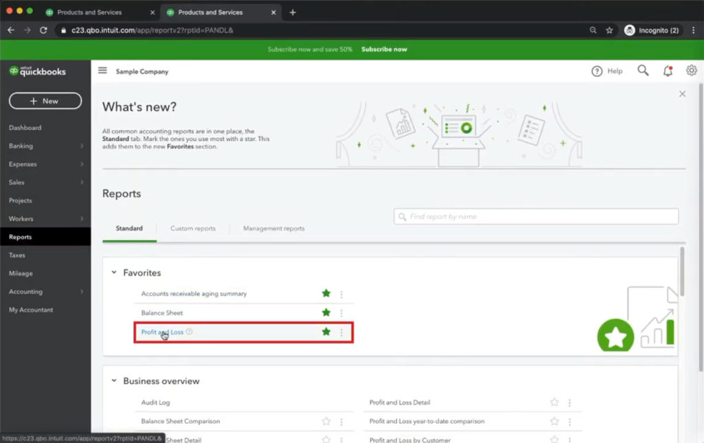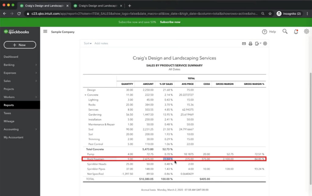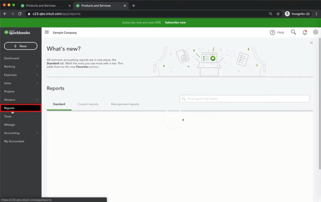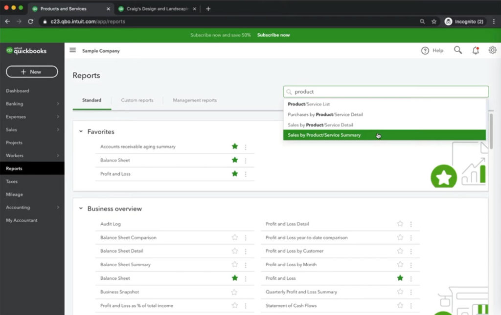 We can also compare products/services and see which ones are our best sellers.  To do list click Reports in the right menu. Search for “Product” and find the “Sales by Product/Service Summary Report.”