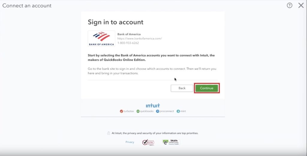 So after we’ve clicked the Add Account button, we’ll need to tell QuickBooks about our banking information. You will now see a screen that has several banks from which to choose. In this example, we’re setting up a Bank of America credit card, so we’ll pick Bank of America. Once we pick Bank of America, we’ll have to sign in to our bank account to grant QuickBooks access to the information it contains. Click the green continue button. An additional screen will then pop up where you’ll need to provide consent to share your data from Bank of America to Quickbooks.