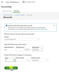 To begin reconciling click Accounting -> Reconcile in the left side menu.